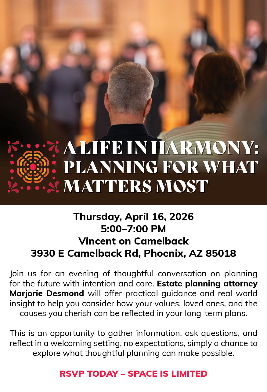 Has the Chorale enriched your life or of a loved one for many years? Consider creating a lasting impact on the musical life of the Valley through a gift in your estate plan, will, or trust to Phoenix Chorale. We have been spreading harmony to multiple generations since 1958 and long-term fans and alumni have been instrumental (no pun intended) in ensuring this legacy continues.